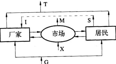 依照凯恩斯关于经济循环的模型,收入(或产出)在厂家和居民中循环运动,从循环中退出的是储蓄(s)、税收(t)和进口(m),进入循环的是投资(i)、出口(x)和政府支出(g),只有进退相等,即c+s+t+m=c+i+g+x时,循环才被视为均衡(如图1所示,其中c为消费)。