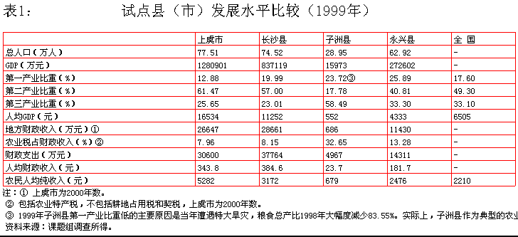 从试点看,经济发展水平较高的浙江省上虞市和湖南省长沙县,人均gdp和农民人均纯收入水平大大高于全国平均水平;中等经济发展水平的湖南省永兴县虽然人均gdp低于全国平均水平,但农民人均纯收入则高出全国平均水平12%;不发达地区的陕西省子洲县属于典型的贫困地区,人均gdp和农民人均纯收入大大低于全国平均水平。由经济发展水平所决定的财政收入状况具有明显的差距,子洲县1999年地方财政收入686万元,人均仅23.7元,而财政支出却高达4967万元(见表1)。