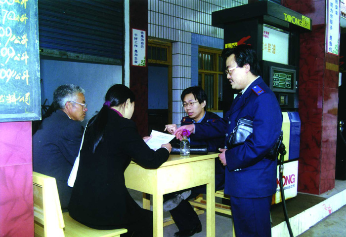 针对个别加油站不顾国家规定,拒不申请安装税控装置的情况,重庆市忠县国家税务局征管分局加大执法力度,严格依法办事,对辖区内加油站进行了认真清查。图为税务人员依法对未安装税控装置的加油站下达税收违法行为限期改正通知书。