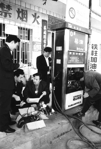 为了整治加油站的税收秩序,湖北省通城县国家税务局管理分局对全县的加油机安装了税控装置,并进行规范化管理。图为分局管理人员在协助生产厂家对业户安装税控设备。
