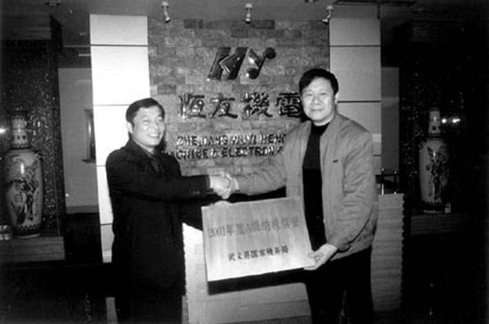为促进纳税人建立诚信纳税意识,浙江省武义县国家税务局从全县6000多户纳税人中评选出10家“纳税a级信誉企业”,为全县纳税人树立了榜样。图为该县副县长徐向民(左)向a级纳税信誉企业授牌匾。