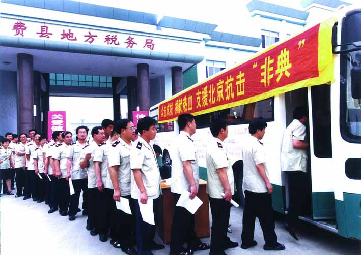 伸出手臂奉献热血真情。山东省费县地税局在克服非典影响,大力组织税收收入的同时,心系北京非典防治,图为该局干部职工踊跃献血支援北京抗击非典。