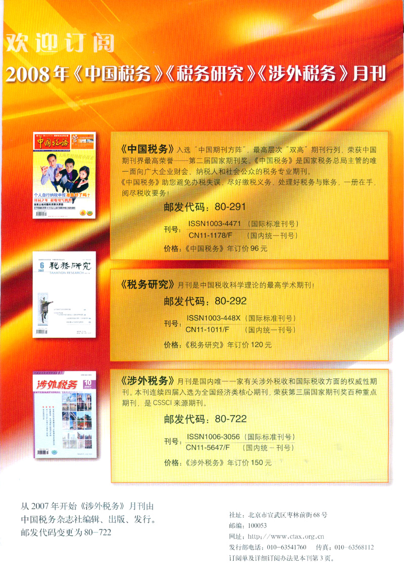 欢迎订阅2008年《中国税务》《税务研究》《涉外税务》月刊