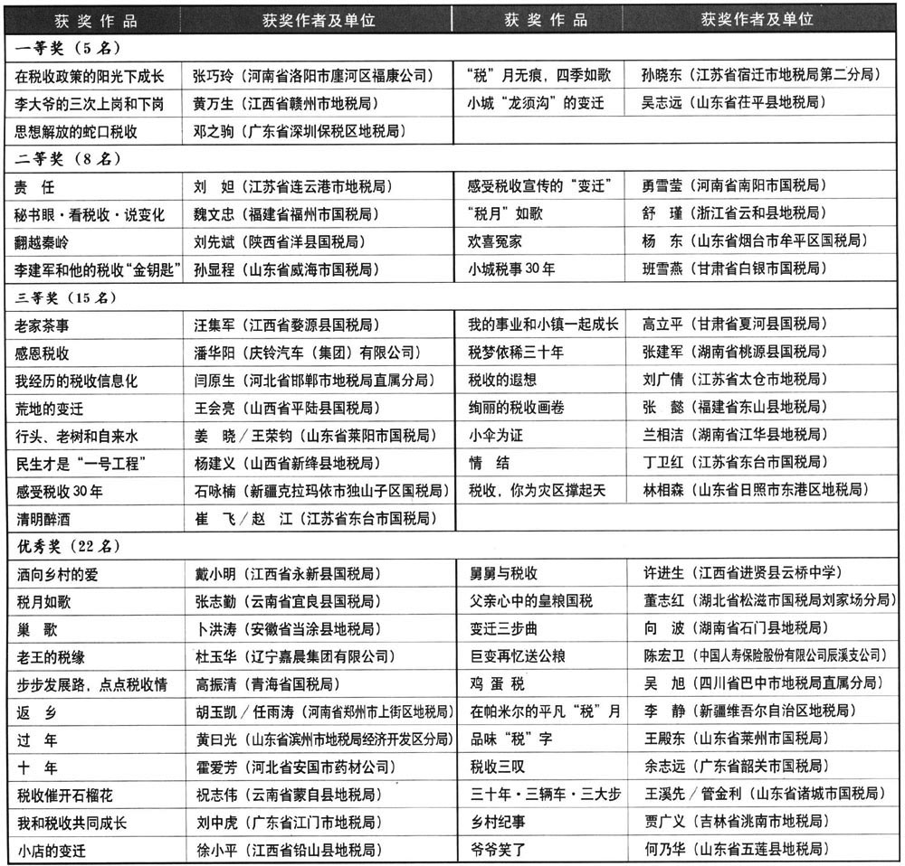 上一篇 下一篇2009年2月14日,由国家税务总局办公厅与中国税务杂志社联合举办的“税收·发展·民生”征文活动进入了最后的评审环节。经专家评审委员会终审评定,《在税收政策的阳光下成长》等28篇文章分获一、二、三等奖,《洒向乡村的爱》等22篇文章荣获优秀奖。至此,历时一年的“税收·发展·民生”征文活动圆满落下帷幕。现将本次征文活动获奖名单公布如下: