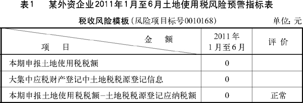 江苏省某地方税务分局对辖区内的外资企业2011年1月至6月的房产税、土地使用税纳税申报情况进行纳税申报审核。评估人员首选一个土地使用税风险预警指标进行分析,发现有一户企业数据异常。