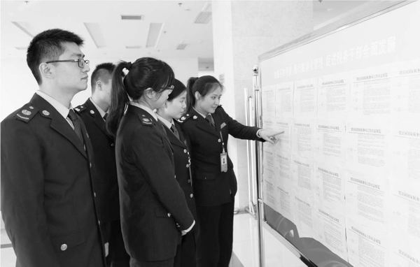 江苏省徐州市国家税务局是国家税务总局“数字人事”试点单位之一。该局税务干部每天都要在网上写电子日志,记录自己的工作情况及学习感悟等。该局通过不定期开展“查考勤、晒日志”活动,干部之间相互学习、取长补短。图为税务干部在观摩优秀工作日志。