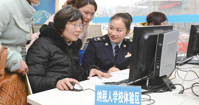 江苏省新沂市国、地税干部联合走访重点税源企业,听取纳税人诉求并进行税收政策辅导。