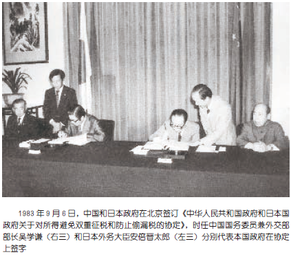 从1980 年开始,经过多轮艰苦谈判,中日双方代表终于对所有条款达成一致。1983 年9 月6 日,我国国务委员兼外交部部长吴学谦同日本外务大臣安倍晋太郎分别代表本国政府在《中华人民共和国政府和日本国政府关于对所得避免双重征税和防止偷漏税的协定》及议定书上签字。协定文本共30 条,对该协定的适用对象、适用税种、各项所得的征税权划分、抵免情况、生效程序等做了规定。该协定在中国适用于个人所得税、中外合资经营企业所得税、外国企业所得税、地方所得税等;在日本适用于所得税、法人税、居民税等。1984 年5 月28 日,中日双方在东京交换外交照会,确认已各自履行了税收协定生效所必需的法律程序。中日税收协定于1984 年6 月26日生效,适用于1985 年1 月1 日以后开始的纳税年度中取得的所得。