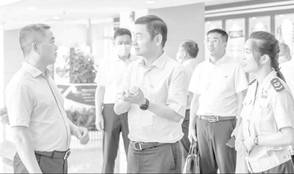 国家税务总局湖南省税务局党委书记、局长刘明权(中)现场询问纳税人办税体验。