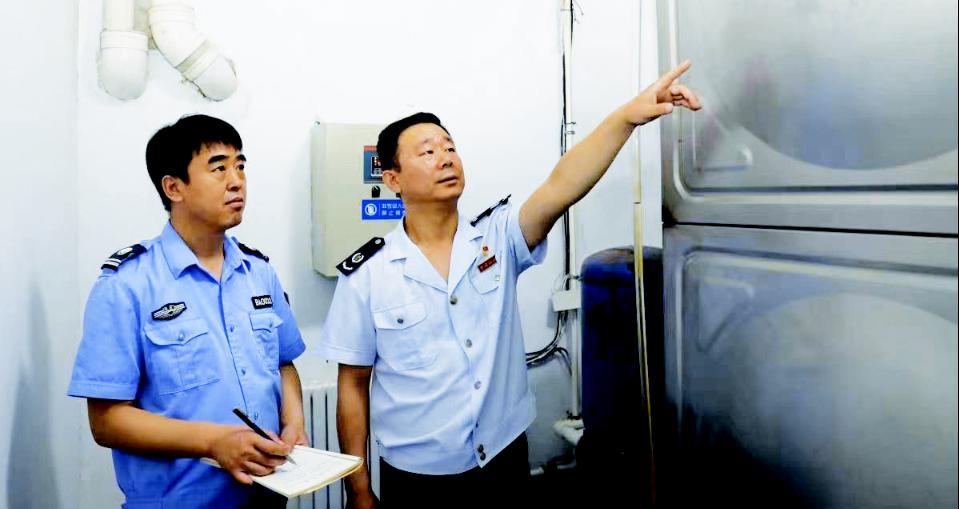 赵传勇(右)带领工作人员检查节能设备。