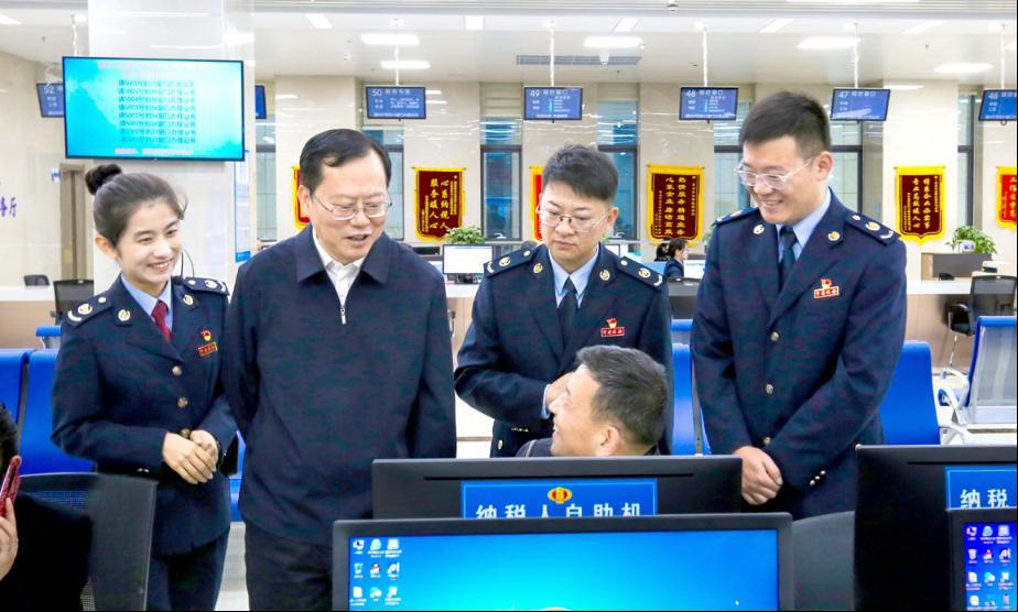 袁继军(左二)在国家税务总局西宁经济技术开发区税务局调研,向纳税人了解业务办理情况。蔡荣山 摄
