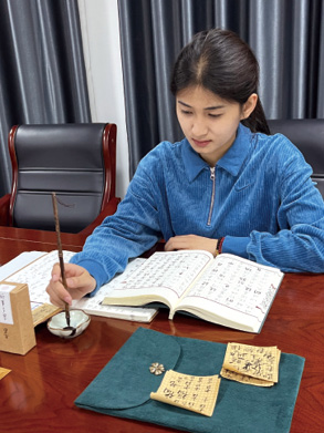 初入税务系统,我常因知识储备和实际经验不足而手忙脚乱、焦头烂额。书法的出现如雨后甘霖,使我沉心静气。结束一天的工作,悉心备好笔墨,饱蘸后临摹,横竖撇捺间,自有规矩意趣,使人专注其中,酣畅肺腑。勾画“撇捺”,描摹“横竖”,不过半小时,却有“五碗肌骨清,六碗通仙灵”的飘然,疲惫尽去,灵魂饱足。书法涤荡思绪,笔墨洗去浮躁,数月练习光阴,使我深知,世间万事,用心方可安心,有度方能有序。