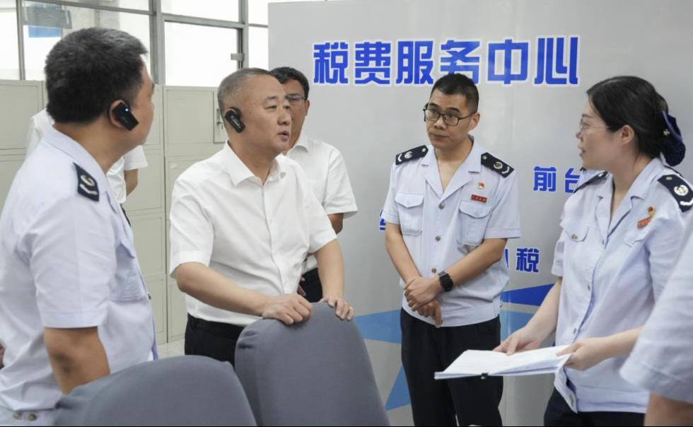 天津市税务系统以打造“税费服务中心”为牵引,推动办税服务厅转型升级,进一步提升便民办税质效。图为国家税务总局天津市税务局党委书记、局长齐志宏(左二)调研基层税费服务中心,与基层干部交流