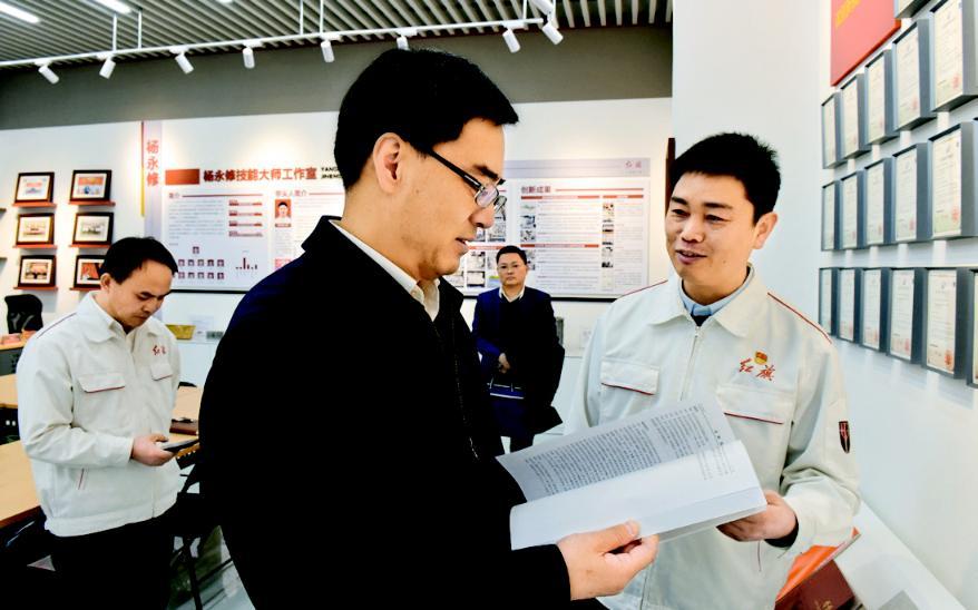全国两会前夕,王宏伟(前)到中国第一汽车集团公司走访,听取全国人大代表杨永修对税务部门引导合规经营、优化税收营商环境等工作的意见建议