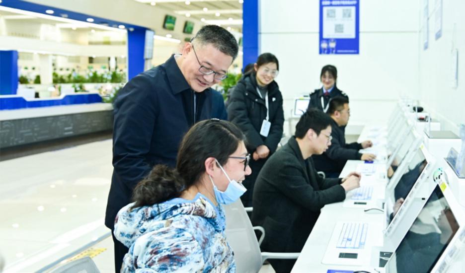 国家税务总局江苏省税务局党委书记、局长许光烈(左一)在办税服务厅调研办税缴费便利化工作
