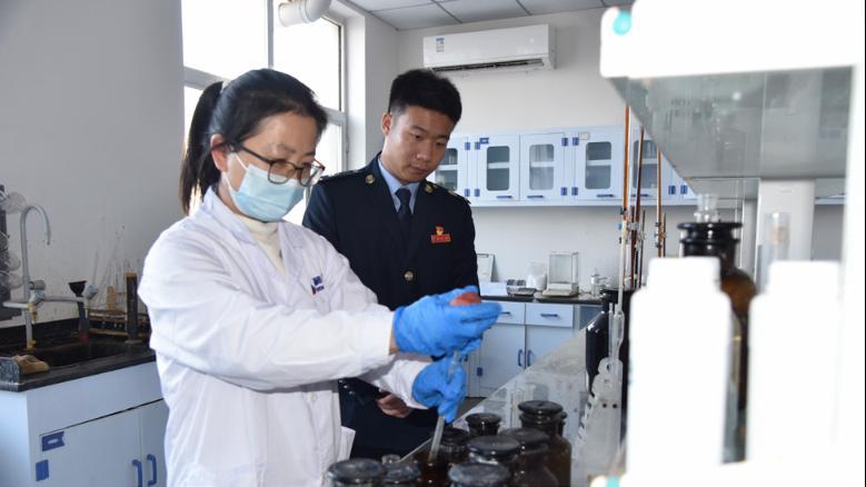 国家税务总局河间市税务局干部在神美科技有限公司化验室了解新技术研发情况