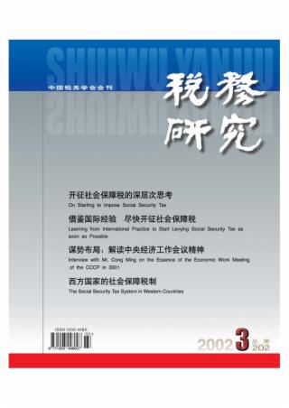 2002年 第3期 税制建设 开征社会保障税的深层次思考 郭庆旺 张德勇 借鉴国际经验尽快开征社会保障税 吴俊培 甘行琼 适应社会保障制度改革的国际趋势合理选择我国社会保障筹资方式 倪红日 企业补充养老保险税收优惠问题探讨 朱青 我国社会保障税税制设计的若干问题的分析 王晓康 本刊专稿 税收的宏观视野(下) ——关于当前若干重大税收问题的分析 高培勇 访谈录 谋势布局:解读中央经济工作会议精神 ——访国务院研究室宏观经济司副司长丛明 本刊记者 韩霖 局长专栏 推进依法治税需要把握的几个问题 刘楚汉 流转税税负的内涵及其对经济增长的影响 苏筱华 来稿摘登 检查企业账外经营行为的几种常用方法 许银奎 唐久康 对计算加收滞纳金规定的建议 许建国 做好农业税收工作应着重搞好“三个结合” 蔡克天 开征社会保障税应遵循的原则及内容构想 王金现 调查报告 改革与创新 ——湖北省地税系统实行稽查新模式的实践与思考 湖北省地方税务局课题组 杨国珍 童启洪 朱国鑫 吴鸿 彭继旺 张季超 王保兰 田和平 税收征管 税务稽查体系的内涵及其规范对策 张滢 杨鹤友 马志国 税务稽查的职能定位 王德平 当前税务稽查工作中存在的问题 程欣荣 浅谈信息不对称理论对税收评估的意义 王磊 信息系统一体化建设与税务管理 吴晓宇 工作研究 加入WTO后我国税收的应对之策 李齐云 刘普照 王新丽 适应加入WTO新形势完善我国增值税制 刘金良 应对“入世”挑战完善关税和消费税制度 张天明 加入WTO后我国税收政策的调整仍有选择的空间 梁红星 王冬生 税收与法制 关于税收优先权 季伟胜 刘帆 我国纳税人权利问题研究 庞凤喜 外国税收及借鉴 西方国家的社会保障税制 崔军 美国促进经济增长的税收政策对我们的启示 唐志萍