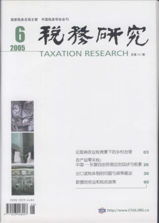 2005年 第6期 论坛 论取消农业税背景下的乡村治理 党国英 返还间接税:形成城乡统一的公共财政体制的必要步骤(*) 杨斌 农民身份与城乡税制统一 李华 农村税费改革后的税收及相关政策取向(*) 马克和 试论我国城乡税制一体化 李成威 税收对就业的影响及其政策选择 曲顺兰 论文摘萃 税务代理整合营销传播策略的意义 郑浩 稽查量化积分考核法的内容 郭桂兰 税收服务本质及实现途径 罗成 本刊特稿 农产品零关税:中国—东盟自由贸易区的现状与前景 刘纯彬 税制改革 出口退税体制的问题与政策建议(*) 中国社会科学院财政与贸易经济研究所课题组 退耕还林(草)与防沙治沙的税收政策研究 付广军 马衍伟 张平国 完善我国生态税收制度的思考 李志远 谈我国生态税费框架的构建 邢丽 激励相容机制下的个人所得税设计 张青 个人所得税征免标准的界定 文桂江 建立以个人所得税为核心的税制结构 任寿根 案例分析 公正执法 保护纳税人的合法权益 傅义 税法理论与实务 我国税收立法现状分析 李香菊 税务行政许可的问题与对策 李敏 税务行政许可若干问题探讨 郭勇平 税务代理的法律风险和防范 韩灵丽 调查研究 推行普通发票控管系统的探索与实践 黄玉远 广东省内区域经济协调发展的财税政策问题 郭驰 工作探索 税收数据处理分析的研究与探索 张德志 郭永利 电子商务环境下税收面临的挑战及对策 王学东 商宪丽 如何科学确定企业所得税的征收方式 吴嘉泽 计税工资对企业行为的影响(*) 李文宏 外国税收与借鉴 欧盟的农业和税收政策 国务院发展研究中心课题组 借鉴发达国家经验 完善我国中小企业税收政策 曾庆宾 刘明勋