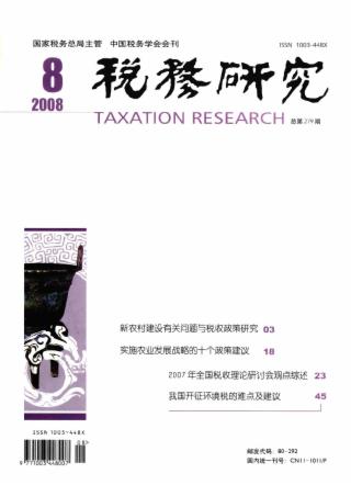 2008年 第8期 论坛 新农村建设有关问题与税收政策研究 国家税务总局税收科学研究所课题组 促进农村社会经济发展的税收优惠政策分析 李本贵 促进农业产业优化的税收政策 谭楚玲 促进农业产业化发展的税收政策取向 刘晓光 施捷 本刊特稿 实施农业发展战略的十个政策建议(*) 刘纯彬 学术动态 2007年全国税收理论研讨会观点综述 赵景华 整理 税制改革 企业集团跨区经营税收分配初论(附表格) 金合赋 建设生态文明的税收政策研究(*) 谭珩 傅靖 张楠 张洪建 我国开征环境税的难点及建议 孙钢 污染产品税在城市垃圾管制中的应用(*) 王建明 我国开征环境税的目标定位与基本构想 洪源 罗宏斌 绿色税收与山西生态文明建设 权立枝 税法理论与实务 新《企业所得税法》中反避税一般条款法律适用的困境与对策 林文生 论税收动态法定原则 邢会强 我国公民纳税意识之分析 许宗凤 刍议税收风险的定义及危害(附表格) 李汉文 有效规避税收执法风险的措施与建议 韩松 姜学东 卢松臣 刘柯群 局长视点 关于风力发电现状及开发利用的鼓励政策 刘景溪 建立基层税务机关征税成本控制体系的思考 陈捷 税收征管 税收稽查选案中的数据挖掘技术 徐正云 构建我国税务稽查选案体系的探讨 潘涛 张凌 房地产业土地增值税征管难点及对策 陈俊良 工作探索 新《企业所得税法》下“会、税”关系研究 李建英 孔燕 新会计准则中公允价值观对纳税调整的影响 刘江华 论文摘萃 浅议个人所得税征管的社会环境建设 肖恺乐 开展税收管理标准化建设的途径 沈阳市税务学会课题组 税史研究 论农业税的起源 黄天华 外国税收与借鉴 国外环境税的激励与融资功能的冲突及协调 唐敬春