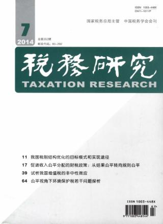 2014年 第7期 税务研究 税务研究 论坛 促进收入分配公平 构建和谐财税政策 ——“促进收入分配公平的财税政策研讨会”会议发言摘要 窦清红 整理 我国税制结构优化的目标模式和实现途径* 胡怡建 徐曙娜 促进收入公平分配的财税政策:从结果公平转向规则公平 曾军平 税制结构对收入分配的影响机制研究* 周克清 毛锐 我国个人所得税调节收入分配效应研析 蔡秀云 周晓君 个人所得税对劳动收入不平等的影响* 魏福成 税制改革 试析我国增值税的非中性效应* 吴俊培 龚旻 税收调节收入分配的局限与作用空间* 贺蕊莉 双重约束下的税制结构优化* 李华 樊丽明 税制结构与后金融危机时代税制改革取向 何杨 税法理论与实务 公平视角下环境保护税若干问题探析 计金标 刘建梅 论环境保护税的立法思想* 马中 谭雪 石磊 程云飞 环境保护税的立法目的 黄新华 全球气候变化背景下WTO碳税边境调整条款的解读 龙英锋 社会保障费与税之关系的基础理论探究* 吴文芳 税收征管 “先办后审”征管模式的优化 ——以湖北省武汉市硚口区地税局为例 丁建华 郭利敏 彭晓蕾 工作探索 “营改增”后交通运输企业的税务风险管理能力* —以沪市上市公司为例 王玉兰 许可 李雅坤
