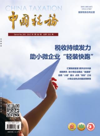 2017年 第8期 中国税务时评 税收铺路搭桥 支持“小微”“双创”发展 本刊特约评论员 时政纵览 大事 观点 数字 税务要闻 在新的起点上深化金砖税收合作 本刊特稿 汇聚税收智慧携手合作共赢 本刊记者 黄诗睿 特别策划 税收持续发力助小微企业“轻装快跑” 减税降负 助小微企业跑出“加速度” 本刊记者 高宏丽 为“双创”厚植一片土壤 本刊记者 黄诗睿 助燃“小微”星火点亮“双创”之光 周 阳 董晓婷 税收与“小微”同行 苗嘉诚 户小红 郑唯舒 减税新风拂绿甘南大草原 赵灵芝 温都格 创业投资企业与天使投资个人抵扣所得税政策解析 高金平 邹婷婷 小微企业 热点问题政策解答 局长论坛 全面推开营改增试点后的 税收治理问题 林京华 我国古代赋税制度演进的 内在逻辑及对营改增的启示 王建平 文化长廊 趣说印花税 蔡鹏飞 药都税事 张 甚 杨宇航 赵文安 家国乡愁 吕 慧 政策解读 研发费用税前加计扣除优惠政策解读及案例分析(下) 陈玉琢 叶美萍 顾 骏 业务指南 营改增后关于土地增值税计算缴纳的六项风险提示 薛 娟 钟税官信箱 钟税官信箱 纳税小提示 纳税小提示 纳税小提示 案例分析 剥开申报疑团觅迹外籍高管境外千万分红 史小军 兰 京 李 铭 李 静 对税收安排“受益所有人” 的判定与甄别 高建秋 唐保华 刘群扬 “互联网+税务” 金税三期全覆盖下的 税收业务监控平台建设 张小贤 王朝玉 武玉强 数字化经济给税务管理 带来挑战与机遇 刘茵莹 王 巍 刘 飞 黄宗寅 严管理 强技术 优化涉税数据安全管理 任东飙 钱敏郁 顾慧武 张海波 税事动态 注重集成运用 推动绩效管理纵深发展 段乌钢 加强对绩效个人重点工作工单的管理 常化林 王 宇 开展“四大行动” 抓实履职尽责 胡胜昔 王 巍 税收助力玫瑰之乡产业结构“换挡升级” 陈宪航 吴建庆 黄 静 征 纳 减税降负为高新企业发展添活力 况淑敏 周子珈 传承文化根脉 凝聚兴税力量 王晓东 “深化税收改革 推进税收现代化”征文 法治与改革双轮驱动 实现土地增值税“良法善治” 李鸿洋 国地税深度合作需要把握好“三个维度” 张为民