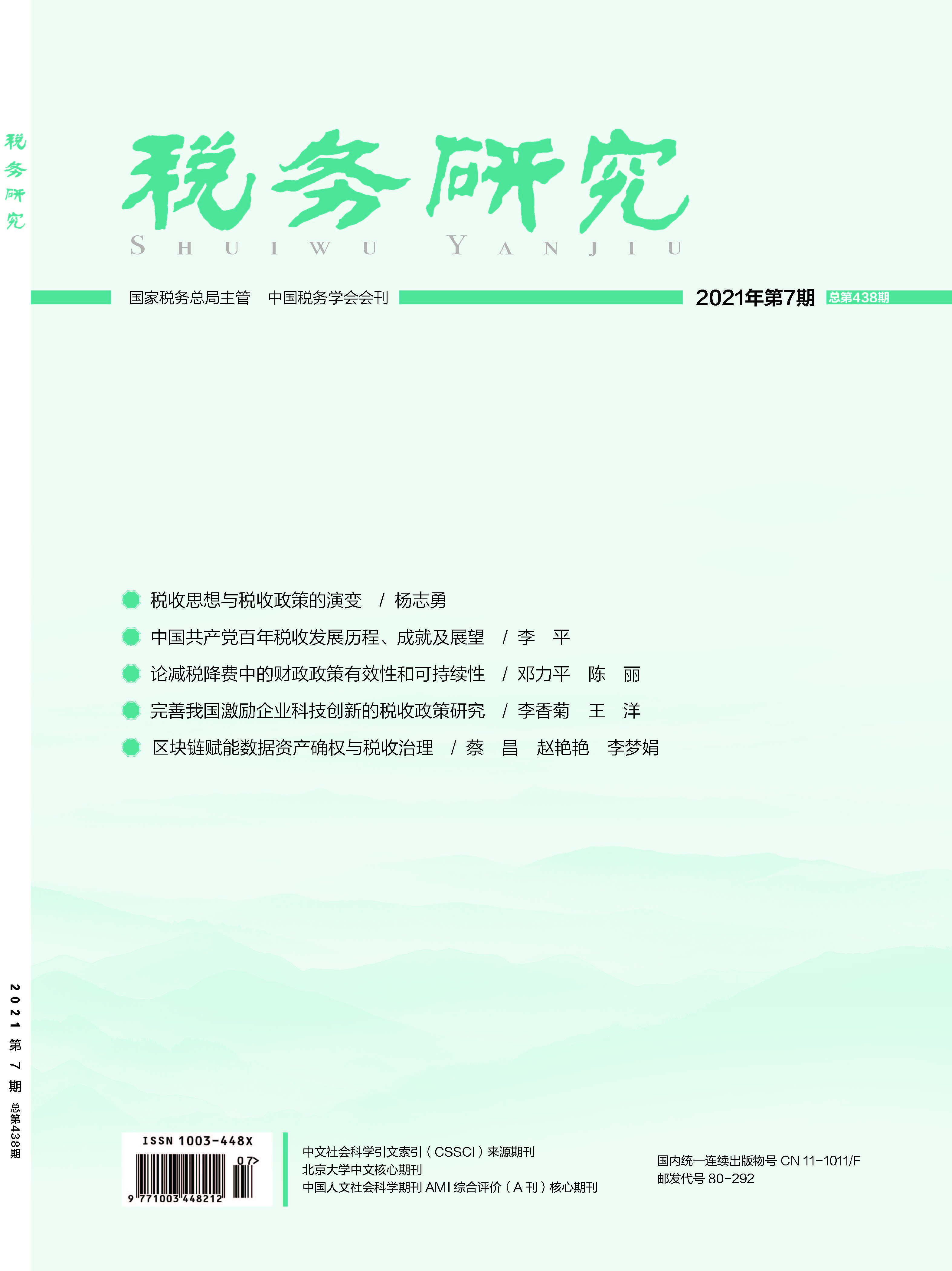 2021年 第7期 建党百年 税收思想与税收政策的演变 ——中国共产党一百年来的探索 杨志勇 中国共产党百年税收发展历程、成就及展望 李平 中国共产党百年治税思想的演进、嬗变与超越* 甄德云 王明世 中国共产党早期税收思想与实践* ——基于中国共产党早期报刊视角 李妮娜 史卫 本刊特稿 论减税降费中的财政政策有效性和可持续性* 邓力平 陈丽 税制改革 完善我国激励企业科技创新的税收政策研究* 李香菊 王洋 创业投资税收优惠政策与创投企业资金流向* 周文斌 后青松 高新技术企业税收优惠政策完善路径研究* 薛薇 张嘉怡 环境保护税对重污染行业企业自主技术创新的影响* 崔也光 鹿瑶 王京 税收法治 增值税立法的进阶路径思考* 刘骏 付春 调节性功能视角下的消费税立法检视 佘倩影 对税收违法“黑名单”制度的几点思考 徐鑫 涉税举报:功能转型与制度优化 单飞跃 王雪蕊 “数字经济与税收治理”征文 区块链赋能数据资产确权与税收治理* 蔡昌 赵艳艳 李梦娟 基于集成理念的大数据时代税收风险管理探析 颜宝铜 研究探索 我国并购重组企业所得税政策效应研究 ——基于A股上市公司的大样本实证检验 尹磊 论我国税收治理理念的历史演进与逻辑规律* 王伟域 促进养老服务高质量发展的财税政策研究* 王浩林 张鸿宇 案例分析 暂缓办理出口退税的可诉性分析 廖仕梅 税收管理 构建税务系统老干部“关注度指数”的方法研究 国家税务总局离退休干部局课题组 基于数字化视角推进税费服务现代化的思考 黄英 高收入群体个人所得税征管问题研究 方东霖 杨沛民 协作趋向与价值共创:新时代中国税务话语体系的内涵与建构逻辑* 温婧 刘文郡 杨子怡