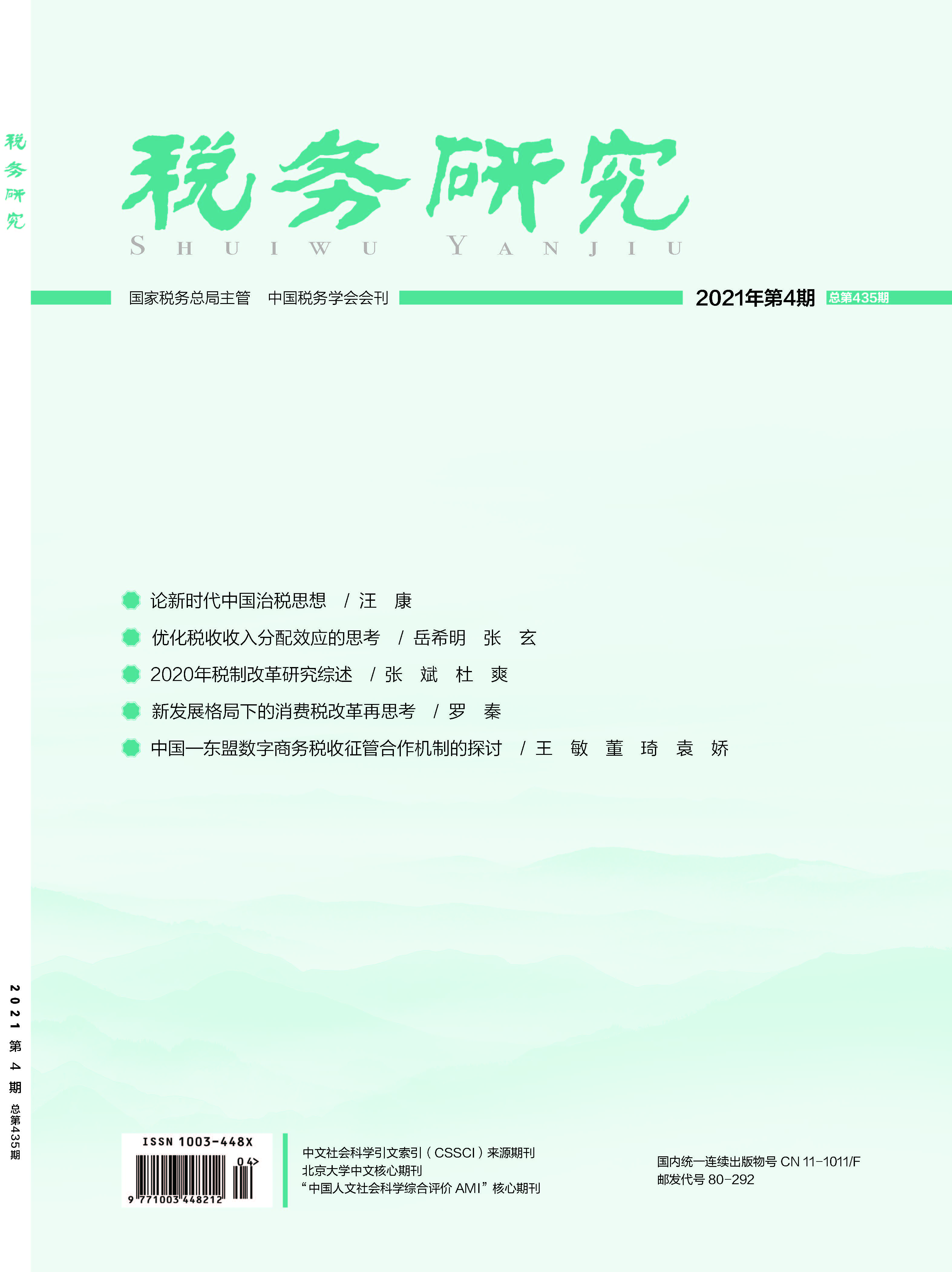 2021年 第4期 本刊特稿 论新时代中国治税思想 汪康 新时代 新征程•税收现代化 优化税收收入分配效应的思考* 岳希明 张玄 我国税收调节收入分配差距的主要障碍及完善* 石绍宾 张玲欣 我国税收影响劳动要素收入份额的实证研究* 薛钢 明海蓉 付梦媛 促进收入分配公平的税收制度完善* 赵桂芝 李亚杰 年度学术研究综述 2020年税制改革研究综述* 张斌 杜爽 2020年度税收法治研究综述* 翟继光 2020年数字化税收管理与服务研究综述* 谢波峰 尹天惠 税制改革 新发展格局下的消费税改革再思考* 罗秦 加快构建新发展格局的消费税改革探讨* 张德勇 消费税征收环节后移改革的品目范围研究* 王文甫 刘亚玲 实行价税分列促进我国消费税调节作用的发挥 李冬妍 陆泽宇 “数字经济与税收治理”征文 数字经济、税收冲击与税收治理变革 马洪范 胥玲 刘国平 人工智能助力税收管理数字化转型的对策分析* 倪娟 李彦璋 周睿 环球税收 中国—东盟数字商务税收征管合作机制的探讨* 王敏 董琦 袁娇 新发展格局下中国—东盟的增值税协调问题研究* 曹静韬 创新税收争议解决机制 畅通中国—东盟经贸合作 新发展格局下中国—东盟税收协调问题研究* 常晓素 李芳 赵礼刚 研究探索 论新时代我国财政收入体系的改革与完善* 杨斌 税收分成对经济增长目标管理的激励效应* 詹新宇 刘文彬 环境税“双重红利”假说CGE实证研究评述 潘欣欣 周志波 税收竞争对我国制造业产业集聚的影响研究* ——基于空间动态面板模型的实证分析 徐青