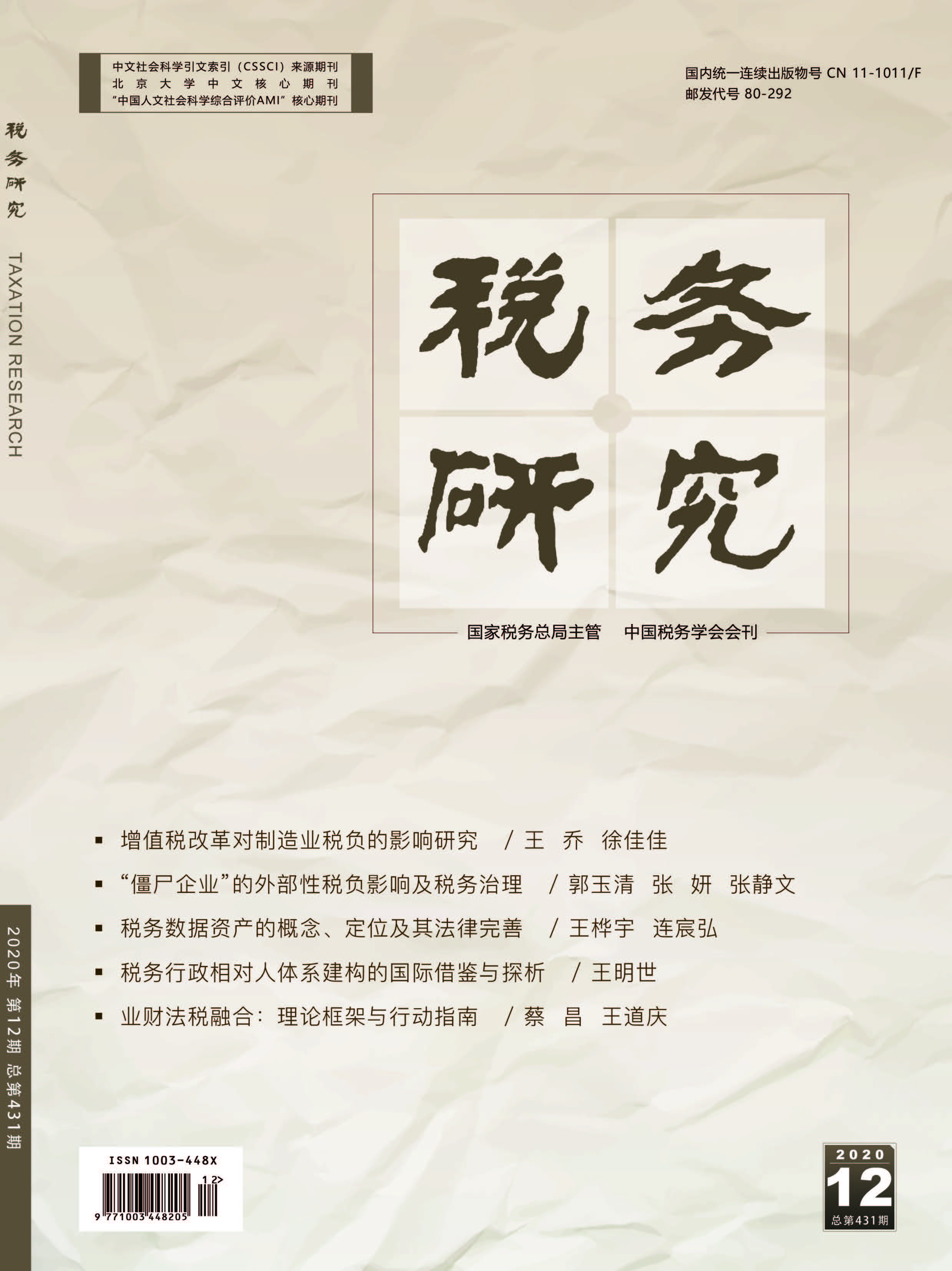 2020年 第12期 新时代税收发展论坛 增值税改革对制造业税负的影响研究* ——基于投入产出法 王乔 徐佳佳 增值税促进社会化分工与专业化协作的逻辑及其检验* 庞凤喜 申珍妮 熊尧 混转假设下增值税税负归宿研究* ——基于一般均衡理论视角 金双华 邱韵智 税制改革 僵尸企业、税负扭曲与产业结构升级* 胡洪曙 梅思雨 “僵尸企业”的外部性税负影响及税务治理* 郭玉清 张妍 张静文 精准支持脱贫攻坚的税收政策及优化路径研究* 杨默如 李平 共享员工新就业形态税收政策探析 袁政慧 赵蓓 “数字经济与税收治理”征文 税务数据资产的概念、定位及其法律完善 王桦宇 连宸弘 应对数字经济的挑战:从生产增值税到消费生产税* 王卫军 朱长胜 “国家治理与税收征管法修订”征文 税务行政相对人体系建构的国际借鉴与探析 ——兼议《税收征管法》的修订 王明世 完善我国税务争议替代性解决机制的构想 ——基于修订《税收征管法》的背景 王郁琛 税收法治 以经济能力为核心价值的税收构成要件论* 聂淼 试论行政确认视角下欠税公告的完善 徐健夫 环球税收 国外最优遗产税理论研究综述与评析* 冀云阳 赵颖博 黄帅 国外税务行政争议解决机制及启示* 谌韵灵 优化非营利组织免税资格管理比较与借鉴 符少花 研究探索 基于投入产出模型看新冠肺炎疫情对我国税收收入的影响* ——以旅游业为例 梁季 陈少波 税收优惠与企业绩效:营商环境和企业性质的调节效应* 税收管理 业财法税融合:理论框架与行动指南* 蔡昌 王道庆 整体政府视角下税收治理的经验与启示* 张学诞 赵妤婕 加密货币属性认定及其相关税务处理探析* ——以比特币为例 XU WANG 邬展霞 学术动态 构建新发展格局 筑牢中国—东盟命运共同体 ——第二届“中国—东盟经贸合作与税收协调论坛”在南宁举行 齐烨 聚焦大数据与税收征管的深度融合深入推进新时代税收治理能力现代化 ——“‘互联网+’背景下大数据与税收征管的深度融合研究”征文研讨会在京成功举办 孙赛凤